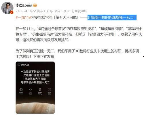 你听说了吗?最近手机界可是炸开了锅,一加11的最新爆料信息简直让人热血沸腾!这款手机不仅外观设计让人眼前一亮,性能上也大有看头。今天,就让我带你一起深入了解一下这款备受瞩目的新机吧!